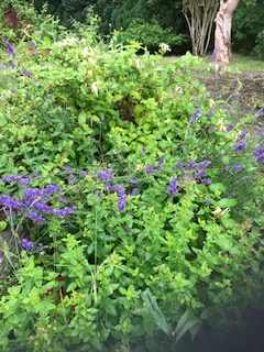 Next is the sweetness of honeysuckle. As well as its perfume I love its confidence as it runs amock, refusing to be bound by its alloted space. This, blends with the more astringent perfume from the underplanted lavender, (this terrace lavender always flowers a few days before those dotted in the wider garden) and accompanies my step on to the paving.